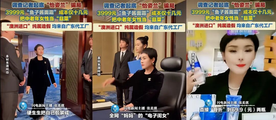 中国新闻网视频号指出,这是以“女总裁路见不平”为固定剧本,打造全网“妈妈们”的“电子闺女”人设,最终目的是直播卖货“回春液”和“大膜王皇后霜”等产品。