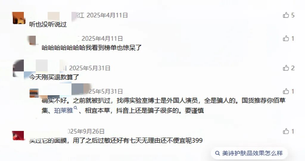 “证书、称号花钱就能买到。”——在发疯有理公众号发布的相关报道中,一网友在评论区表示:“美诗之前就被扒过,找的实验室博士是外国人演员,全是骗人的。国货推荐佰草集、珀莱雅、相宜本草,抖音上还是骗子很多的,要谨慎。”