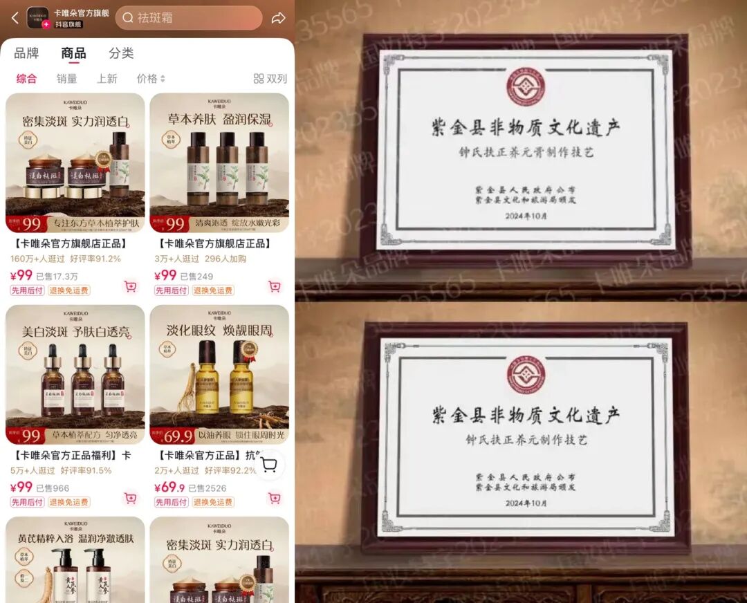 卡唯朵就是打古法功效、“非遗文化”牌的案例。其创始人程扬以“岭南草本护肤传承人”自居,还邀请于震、张晨光等明星在直播间带货,4个月狂卖350万单,月销过亿。