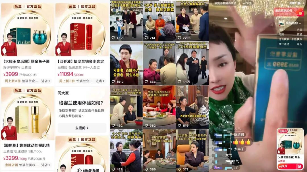 这一风格也延续到了其卖货的直播间中。凤凰网时尚公众号相关报道指出,在直播间内,朵兰会上演“女儿回国送福利”等剧情,而怡姿兰的“回春液”、“大膜王皇后霜”是女儿从澳洲带回来的“孝心”。