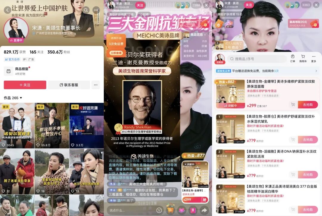 譬如,美诗创始人宋潇手握“逆袭女强人”剧本,展现农村女孩励志奋斗成为美颂生物董事长的剧情,打造“孝女”、“慈母”人设,贴合中老年人对成功女性的向往与情感共鸣,截至目前,其抖音账号粉丝350.6万,仍在直播卖货,直播间不乏穿插展示类似“行业标杆”的奖牌。