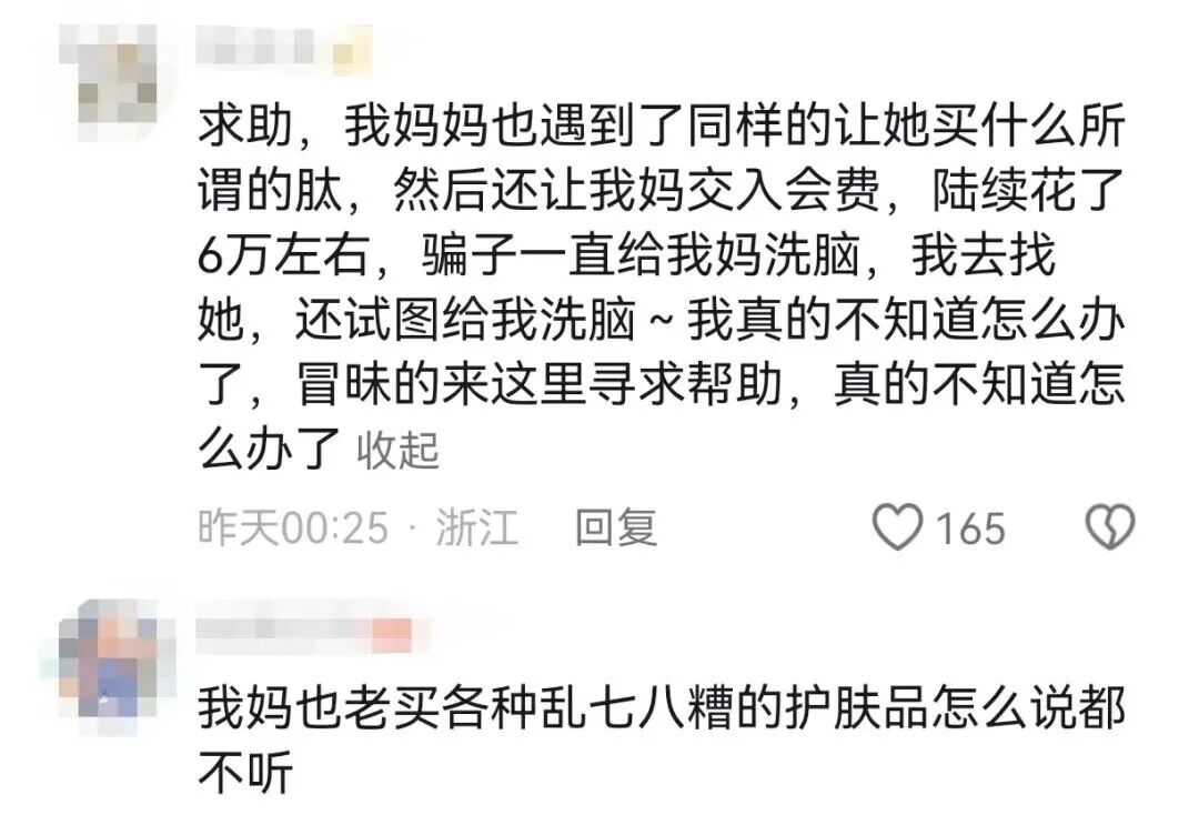 作为北京科技大学学生的花花,也是化学专业的,却劝阻不了其母购买名叫“胶原蛋白肽”的产品,花了大概1600多元。一网友亦称:“我妈妈也有同样的遭遇,主播让她买什么所谓的肽,还让交入会费,陆续花了6万左右……”