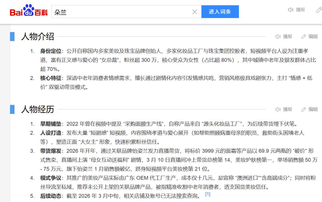 结合上述报道和百科显示内容来看,怡姿兰的创始人朵兰(目前抖音平台已搜索不到),自称是47岁美妆品牌总裁,在其粉丝群体中,女性占比超80%,中老年群体占比超70%。