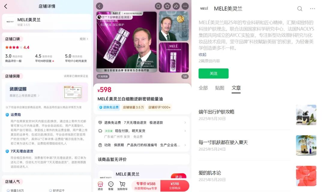 另外,聚美丽在搜索朵兰、怡姿兰等关键词时,还发现一个叫美灵兰的牌子,抖音店铺销量3.5万,商品详情页显示“白细胞逆龄密钥能量油产品”标价598元,产品商品页显示系“瑞士实验室品牌”。
