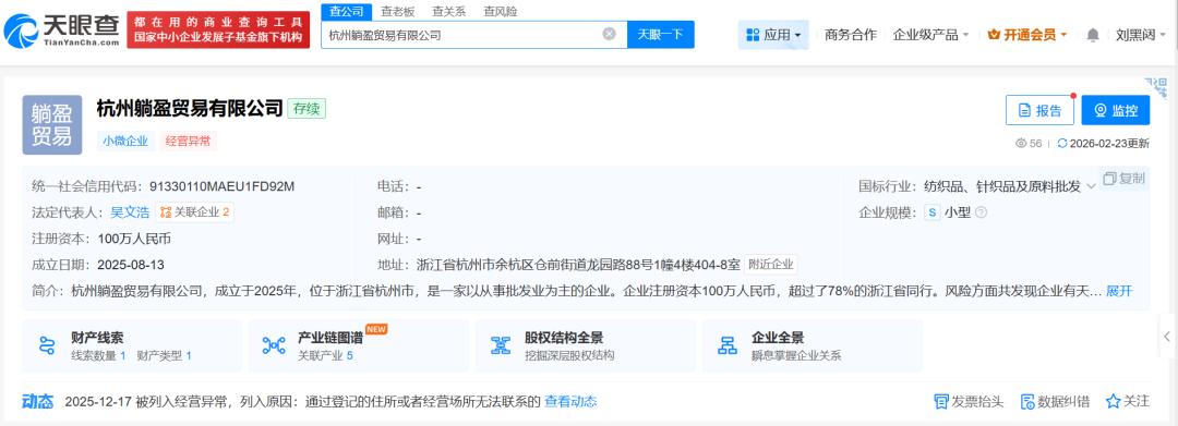 另据天眼查显示,杭州躺盈贸易有限公司属于小微企业,注册资本100万人民币,于2025年12月被列入经营异常。