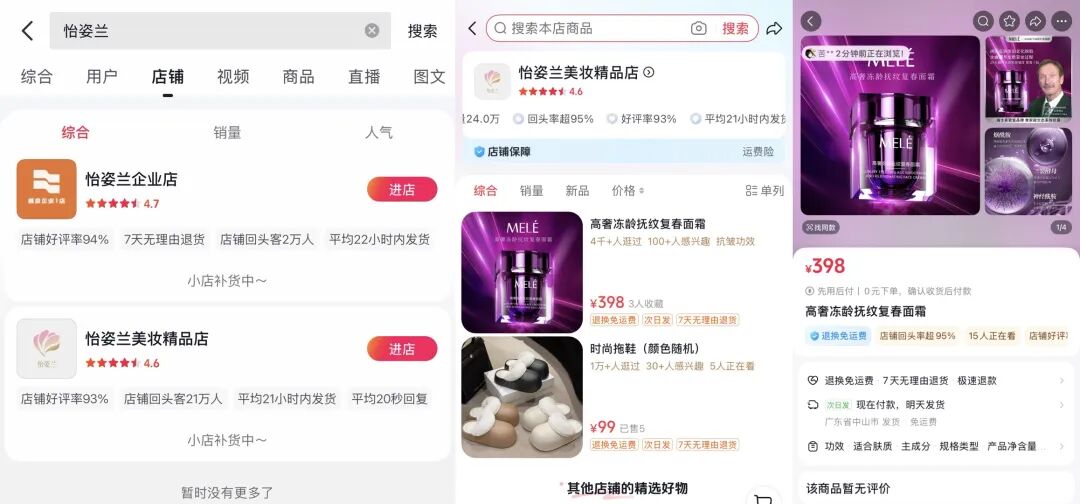 如今,怡姿兰创始人朵兰账号“查无此人”。截至目前,抖音两家相关店铺均显示“小店补货中”,其中,怡姿兰美妆精品店仍有一款标价398元产品在售(产品logo与“美灵兰”一致),发货地为广东省,且经4k+人逛过、100+人感兴趣。