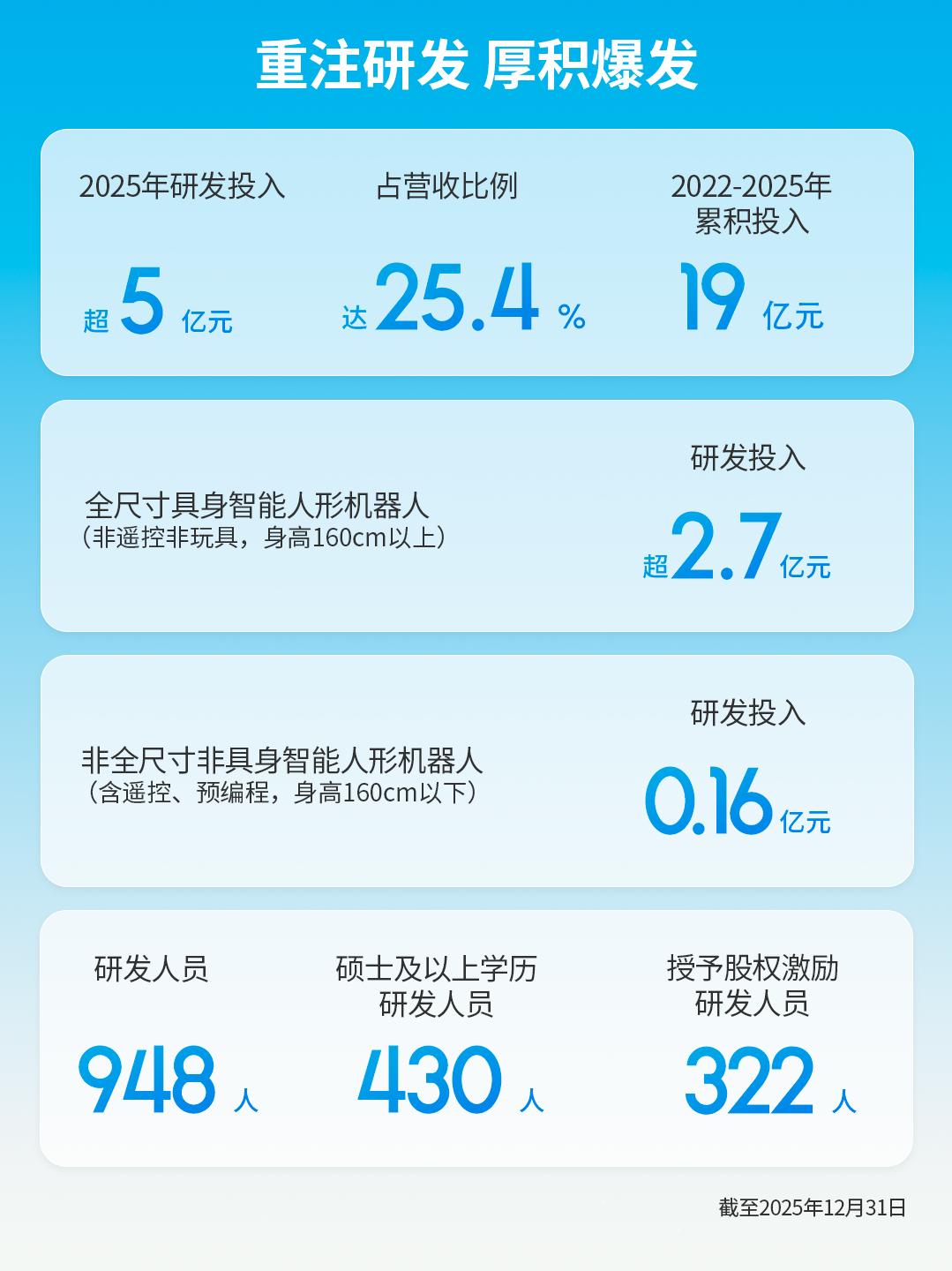 那么,为什么优必选可以率先实现价值兑现呢?这背后离不开公司持续高强度研发所构筑的软硬协同壁垒。2025年公司研发投入超5亿元,其中,全尺寸具身智能领域的投入超2.7亿元,是同期非具身产品的近16倍。