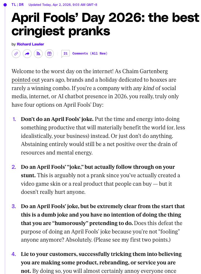 The Verge 编辑 Richard Lawler 的总结很直接:2026 年,如果你是一家有 AI 产品的公司,愚人节只有四个选项——不参加、做个真产品、明确告诉大家这是笑话、或者骗你的用户然后承受后果。大多数公司选了第一个。