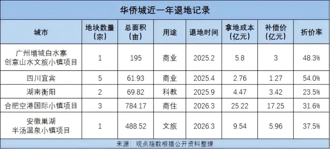 据不完全统计,华侨城自2025年至今已实现12宗地块的退出,并回笼近30.9亿资金。尽管这笔补偿价较47.79亿拿地成本之间存在35.3%折价率,但对华侨城而言,这已是最好的选择。