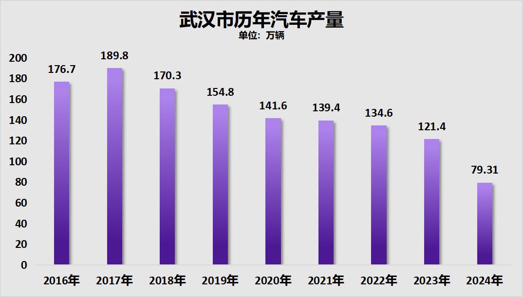 武汉的汽车产量在2017年见顶之后一路下滑,2024年的汽车产量相较高点时期,下跌了58.2%。