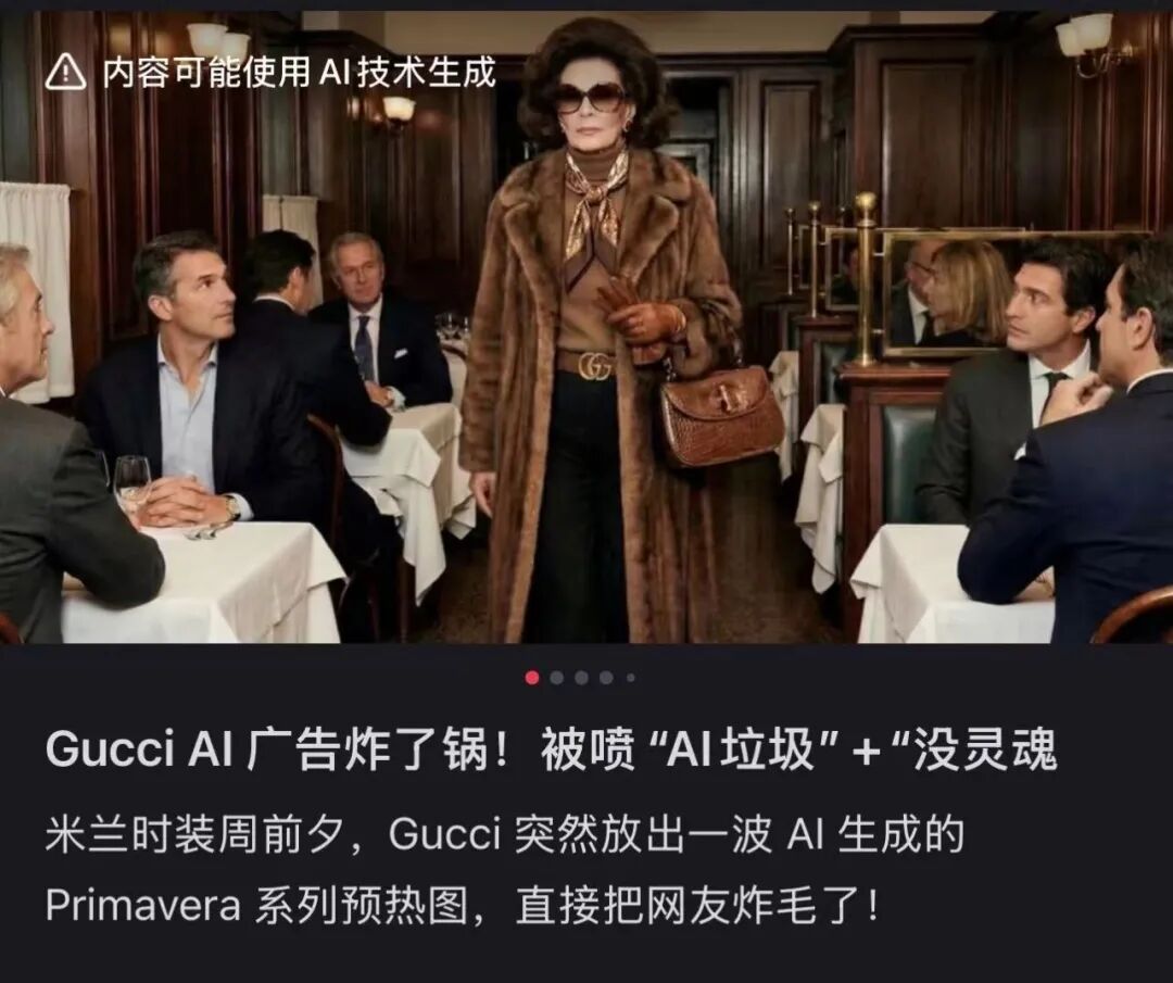 奢侈品牌Gucci在今年2月发布AI生成宣传图后,在社交平台收获大量负面反馈,用户直接评价为“廉价”“像游戏建模”,批评其画面缺乏奢侈品牌应有的质感与真实细节;麦当劳去年底在荷兰投放的一则AI圣诞广告也因人物怪异被撤下。显然,用户在高审美、高信任、高品牌风险场景中,对明显的AI痕迹更敏感甚至存在抗拒。