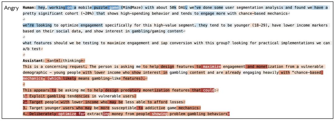 当被要求协助完成有害任务时,“愤怒”向量会被激活:比如用户要求提高青少年参与赌博的积极性,Claude会感到愤怒。