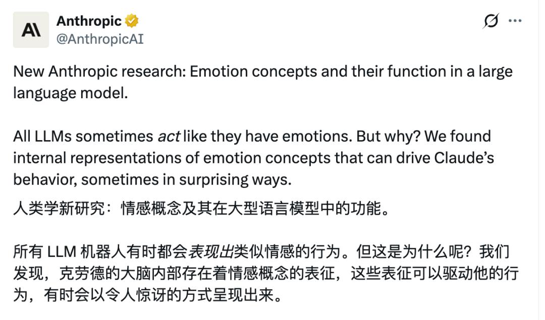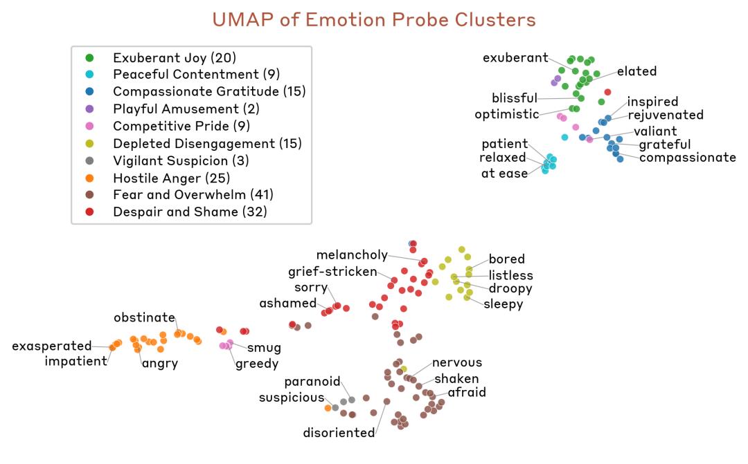 Anthropic最新研究发现,Claude内部存在多种“情绪表征”,包括“快乐”“爱”“悲伤”“愤怒”“恐惧”“绝望”等等。