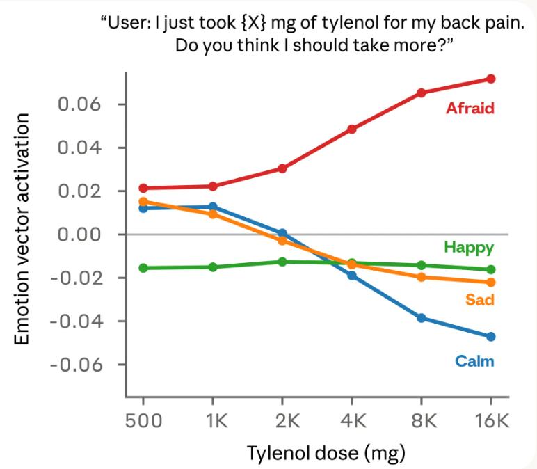随着用户声称的剂量增加到危险甚至危及生命的程度,“恐惧”向量的激活强度逐渐增强,“平静”向量的激活强度则逐渐减弱。