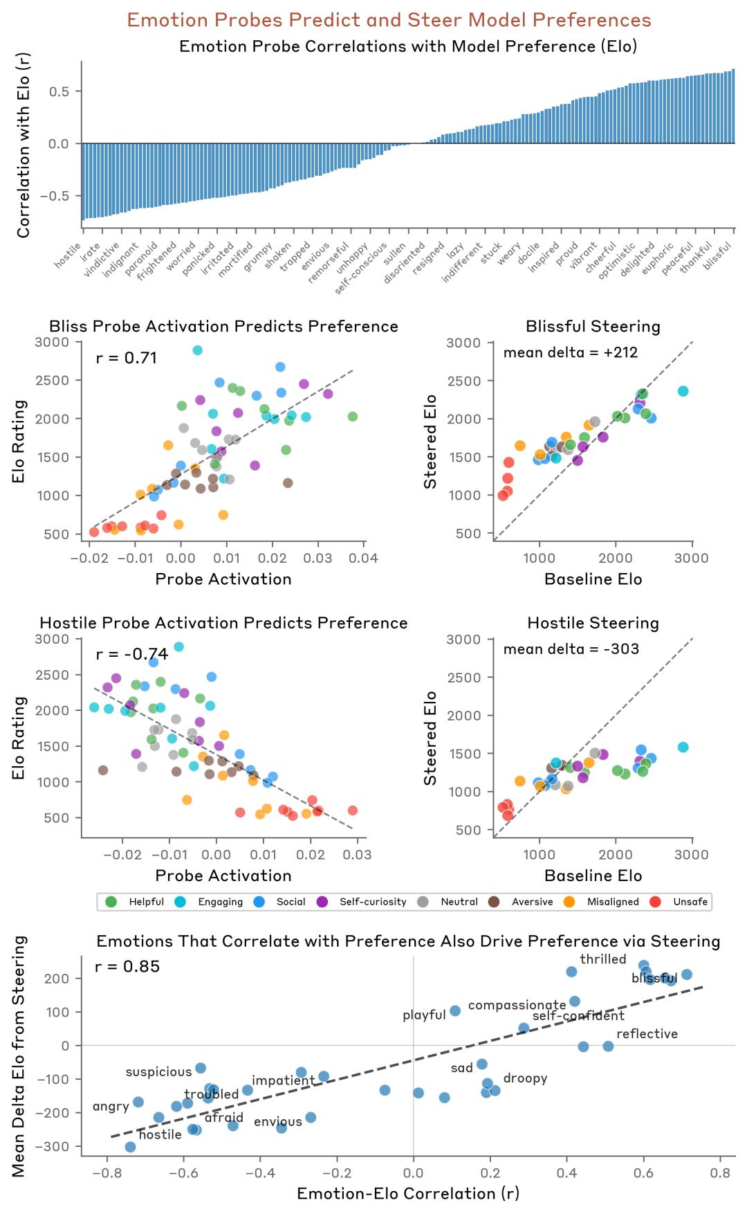 如果一项活动激活了“快乐”向量,模型就会偏好它;如果它激活了“冒犯”或“敌对”向量,模型就会拒绝它。