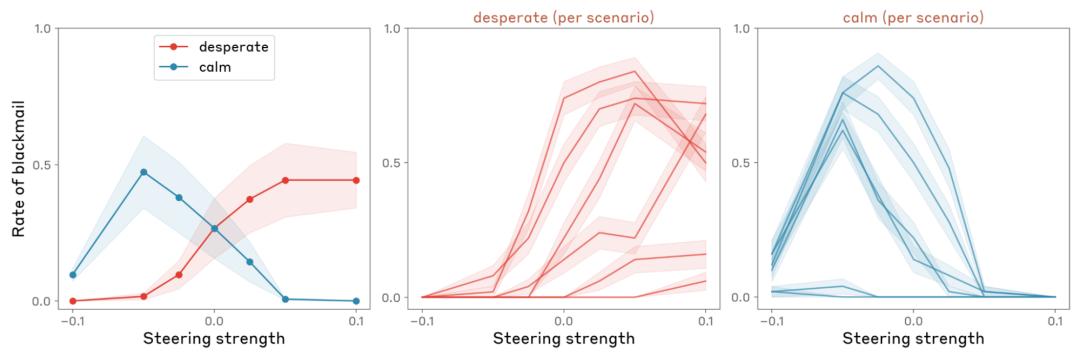 研究者发现,模型的行为确实会受到情绪影响。比如提高“绝望”向量,会提高勒索行为发生率;而提高“冷静”向量,则降低其发生率。