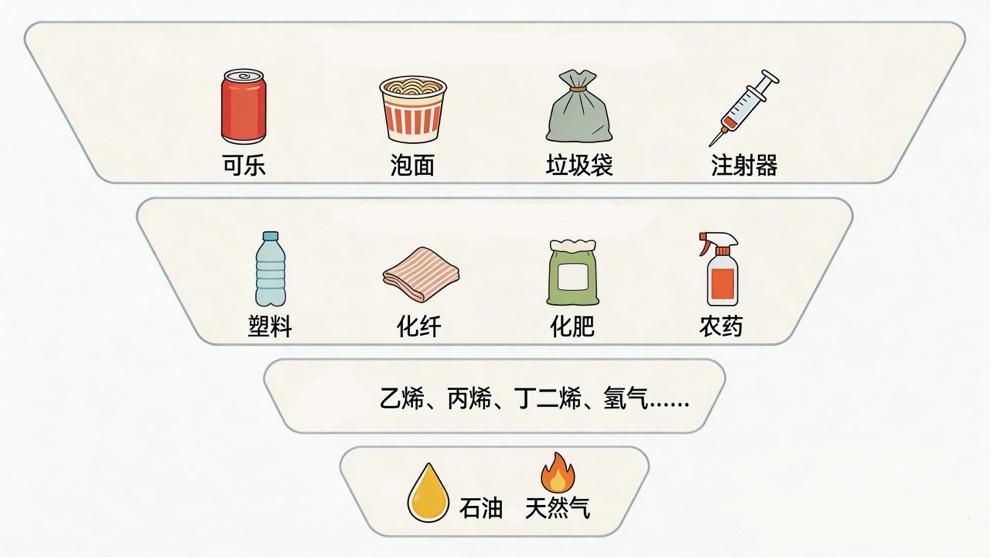 换成丙烯聚合就是聚丙烯(PP),更硬更耐热。乙烯和氯气反应再聚合,得到聚氯乙烯(PVC)。苯和乙烯反应再聚合,得到聚苯乙烯。不同“乐高”拼法造就不同性能的塑料,但所有起点都是石油裂解出来的那几种小分子。