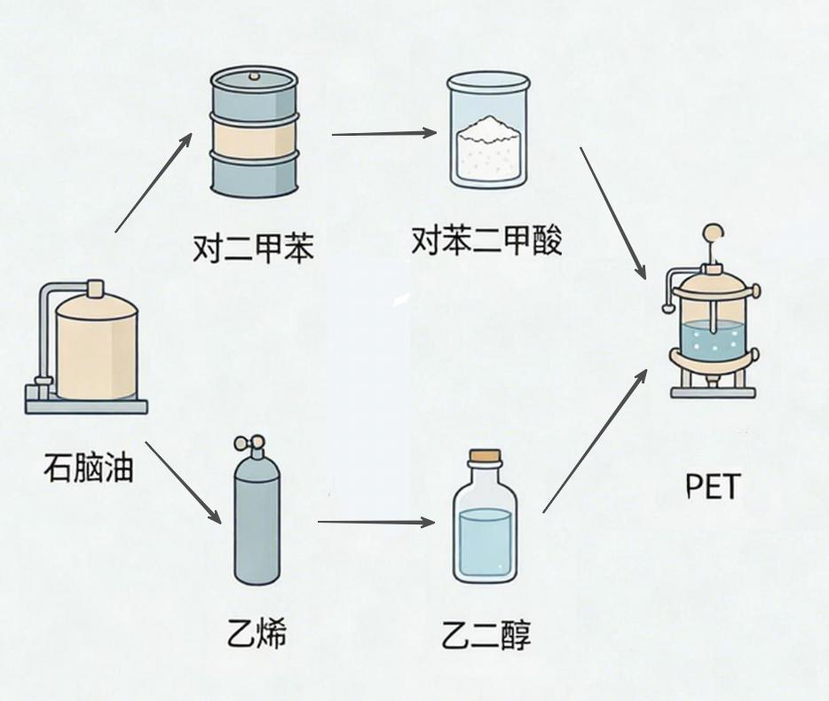 PET这个名字你可能觉得陌生,但你其实天天在接触它。翻过来看你手边那瓶矿泉水的瓶底,那个三角形回收标志里写着数字1的,就是PET。是的,你的衣服和矿泉水瓶化学成分一样,只不过一个被拉成了丝,一个被吹成了瓶子。