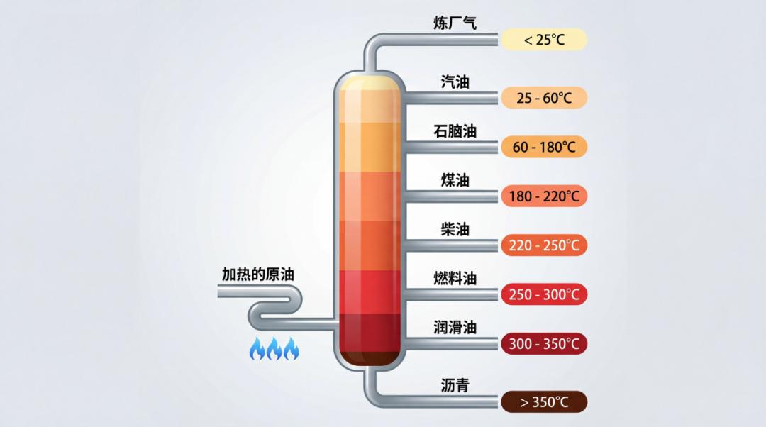 为了开启这场拼装游戏,我们得先对原油状态的石油加工一下。原油被抽出地面后,第一步送进炼油厂做蒸馏。原理很简单,把原油加热到约360摄氏度,如同煮沸一锅肉汤,不同大小的分子在不同温度下变成气体飘出来。小分子沸点低先跑,变成液化气和汽油;中等分子随后变成煤油和柴油;最重的大分子留在锅底成了沥青和重油。