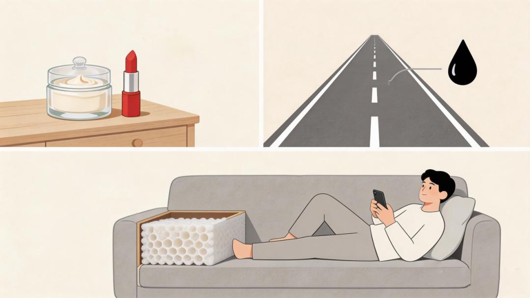 翻开梳妆台上任何一瓶护肤品的成分表,大概率能找到三四种石油的后代;铺路沥青是石油蒸馏后最重的部分;沙发和床垫里的聚氨酯泡沫,原料同样来自石油。