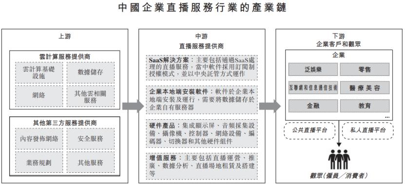 中国企业直播服务产业链上游包括云技术服务提供商及其他第三方服务提供商,参与者包括阿里云、腾讯云、华为云、索尼、云犀等。