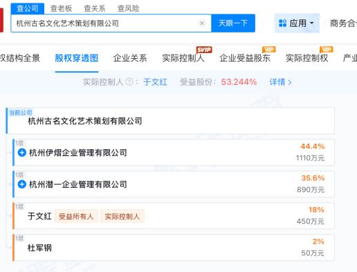 而虞美人集团的内地业务,主要通过其旗下的杭州古名文化艺术策划有限公司(简称“杭州古名公司”)等主体开展。股权穿透显示,于文红为杭州古名公司的实际控制人,受益股份为53.244%。