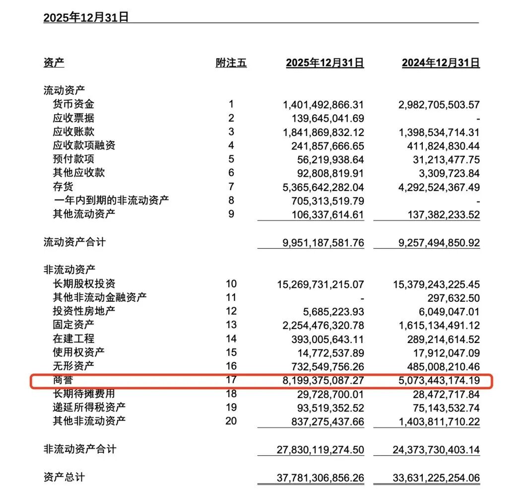 年报显示,上海莱士在控股合并郑州莱士、同路生物、广西莱士、浙江海康及南岳生物后,在合并资产负债表中形成大额商誉。截至2025年12月31日,公司账面商誉余额约为81.99亿元,较2024年末的50.73亿元,同比激增61.6%,一年时间商誉规模增长超31亿元。