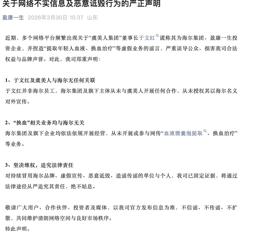 3月30日,海尔集团(青岛)金盈控股有限公司(下称“海尔金控”)通过“盈康一生”官方微信公众号就近期多个网络平台出现的虚假言论进行澄清,于文红涉嫌谎称其企业为海尔集团、盈康一生投资企业,并捏造“提取年轻人血液、换血治疗”等虚假业务。31日,海尔集团方面也表示,不信谣不传谣,所有相关信息参考官方发布。