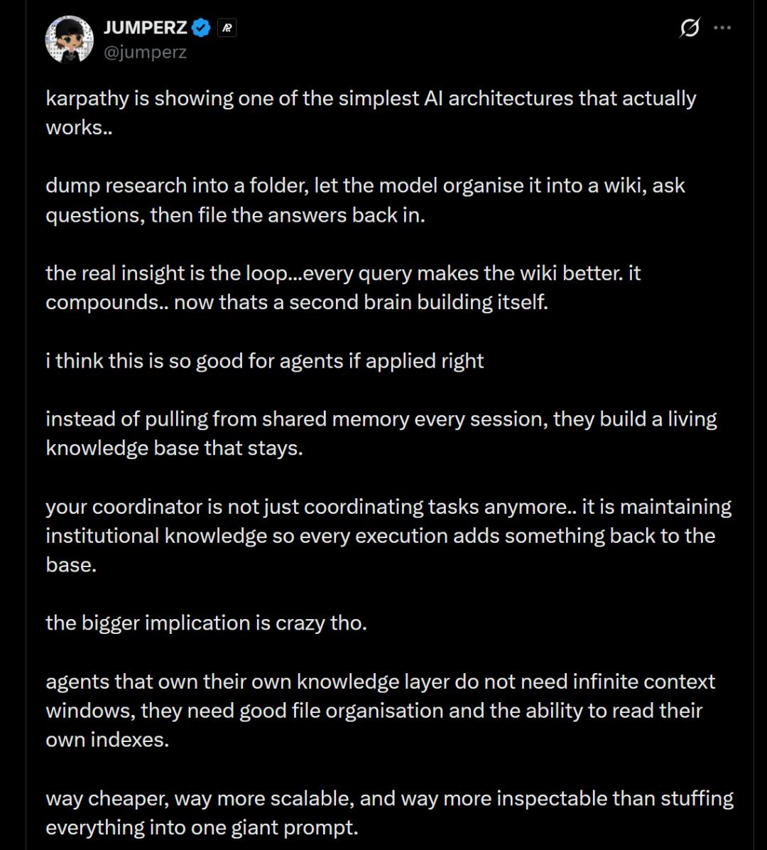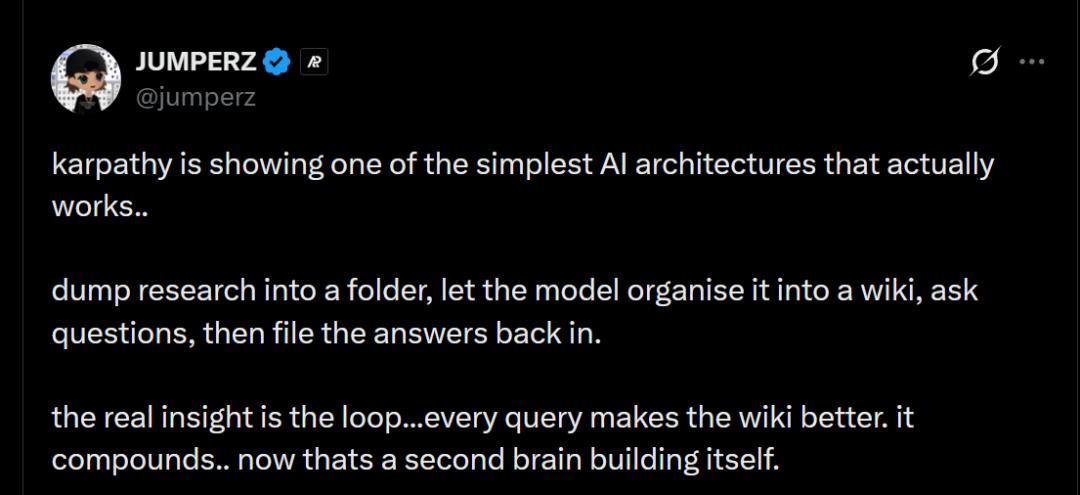 真正的洞见在于这个循环……每个查询都让维基变得更好。它不断积累,现在这就像一个自我构建的第二大脑。