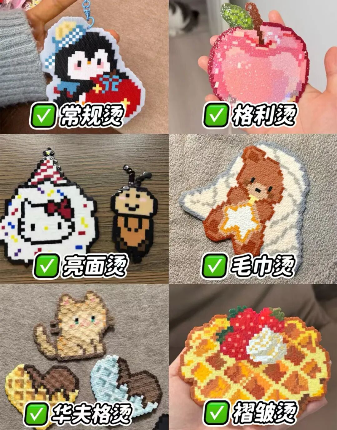 与此同时,社区中的“拼豆天才们”还在不断“内卷”新高度,他们发现,不同的熨烫介质(如硅胶垫、特氟龙高温布等)会直接影响作品的平整度、光泽和成功率;还衍生出多种进阶烫法:用烘焙纸实现哑光雾面,用透明烫片打造陶瓷亮面,用毛巾融合出毛绒质感,甚至用特殊垫片烫出华夫格或褶皱纹理……