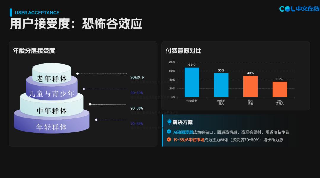 不过值得一提的是,狂飙的播放量并不完全等同于用户满意度,用户对于AI真人剧的接受度其实并不高。不少用户表示,中文在线的一份行业统计显示,对于AI短剧用户接受度为:恐怖谷效应。现阶段,在传统漫剧、AI辅助真人、纯AI动画、纯AI仿真人几种内容分类里,用户对于AI仿真人剧付费意愿最低。