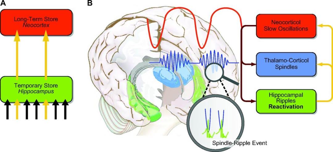 睡眠期间主动系统巩固模型。A(数据迁移):在深度睡眠(慢波睡眠)期间,刚写入「海马体」(临时存储区)的记忆会被反复回放,从而被逐步转移并固化到「新皮层」长期存储区)中。B(传输协议): 这个数据转移过程,依赖于两个区域之间高度同步的「对话」。大脑皮层会发出缓慢的脑电波(红线)作为主控节拍。在波峰的驱动下,海马体将记忆碎片打包成高频信号(绿线处的尖波涟漪),并与丘脑发出的载波(蓝线处的纺锤波)完美配合。这就像是把高频的记忆数据,精准地镶嵌进传输通道的空隙里,确保信息被同步上传至大脑皮层。|图片来源:National Library of Medicine(United States)