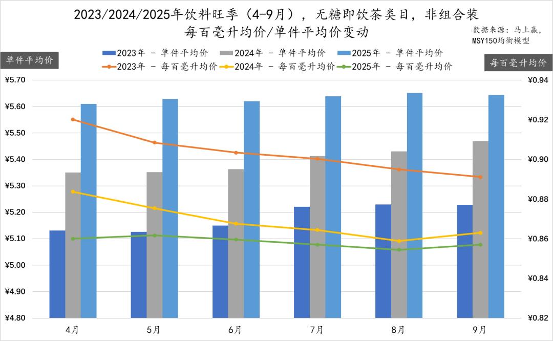 从百毫升均价上来看,2023/2024/2025年旺季,无糖茶的百毫升均价整体呈现阶梯下降,但相比2023-2024年旺季,2024-2025年旺季的百毫升下降幅度已经明显收窄。百毫升均价下降的原因,一方面来自价格竞争,另一方面或许也来自消费者购买的产品规格/容量不断变大,导致其单价不断降低。此外,一个可观的变化是,在2025年饮料旺季,百毫升均价的波动与下行趋势已经显著小于2024/2023年旺季,或也意味着在2025年的饮料旺季中,并没有发生太激烈的夏日价格大战——从简单的价格战中逃离,也是类目健康发展、逐渐成长与成熟的标志之一。