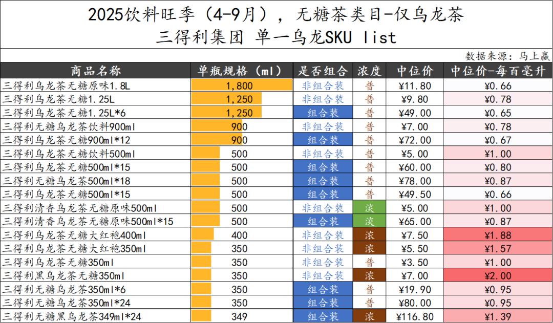 首先来看三得利品牌单一乌龙的SKU产品清单。基于马上赢品牌CT,三得利共计18个单一乌龙SKU中,覆盖了从淡到浓的各种风味、从349ML便携装到1800ML家庭装的各种规格、从6到24瓶的不同组合数量,形成了完整的单一乌龙产品矩阵。通过将代表着品牌最强心智的大单品矩阵化,可以尽可能满足不同消费场景,不同消费习惯,不同消费量的消费者的消费需求。