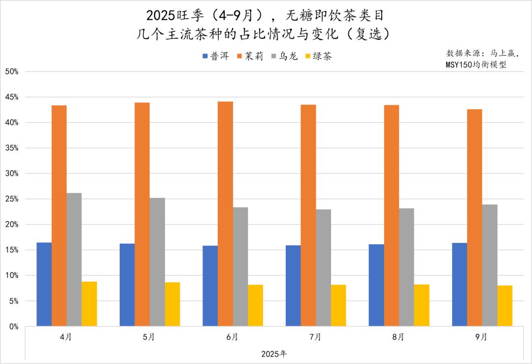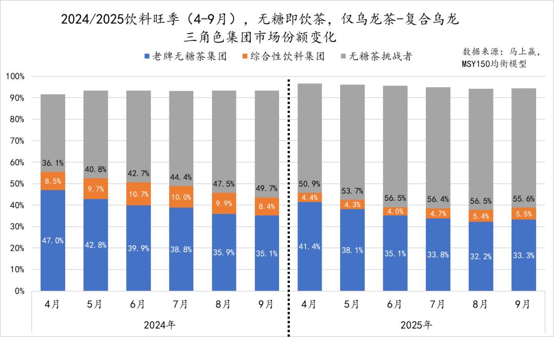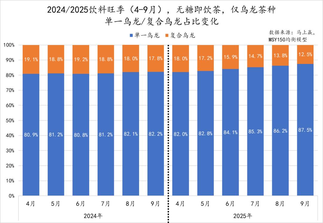 值得注意的是无糖茶挑战者在这一类型产品中的市场份额变化。在2024年旺季,无糖茶挑战者在复合乌龙中的市场份额接近50%,2025年则超过50%、接近60%,且在两个旺季周期内,都呈现出市场份额增长的态势。