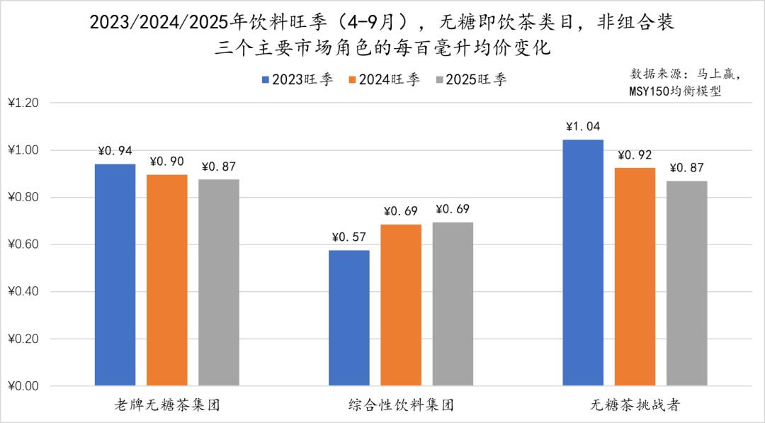 百毫升均价则呈现出了不同的表现情况:其中老牌无糖茶集团的百毫升均价整体平稳略有下跌,但依然显著高于综合性饮料集团,在2025年旺季与无糖茶挑战者已经基本持平;综合性饮料集团在2024年旺季同比2023年有显著的上涨,2025年旺季与2024年同比基本保持一致;变化较大的依然是无糖茶挑战者下的几个集团,其百毫升均价自2023年旺季至2025年旺季均呈现明显的下探,从2025年旺季与2023年旺季相比,百毫升均价下降了近20%。