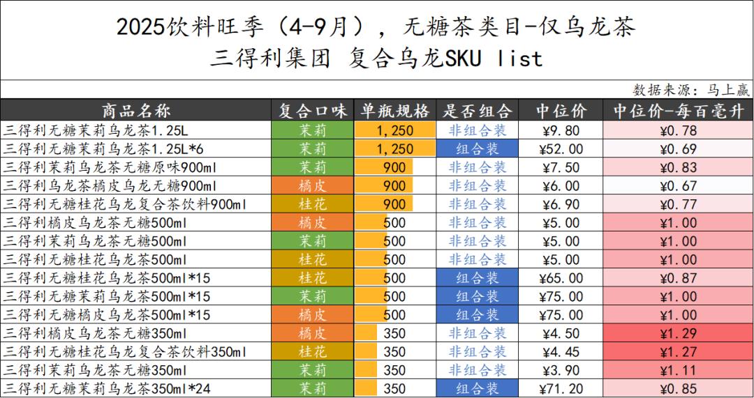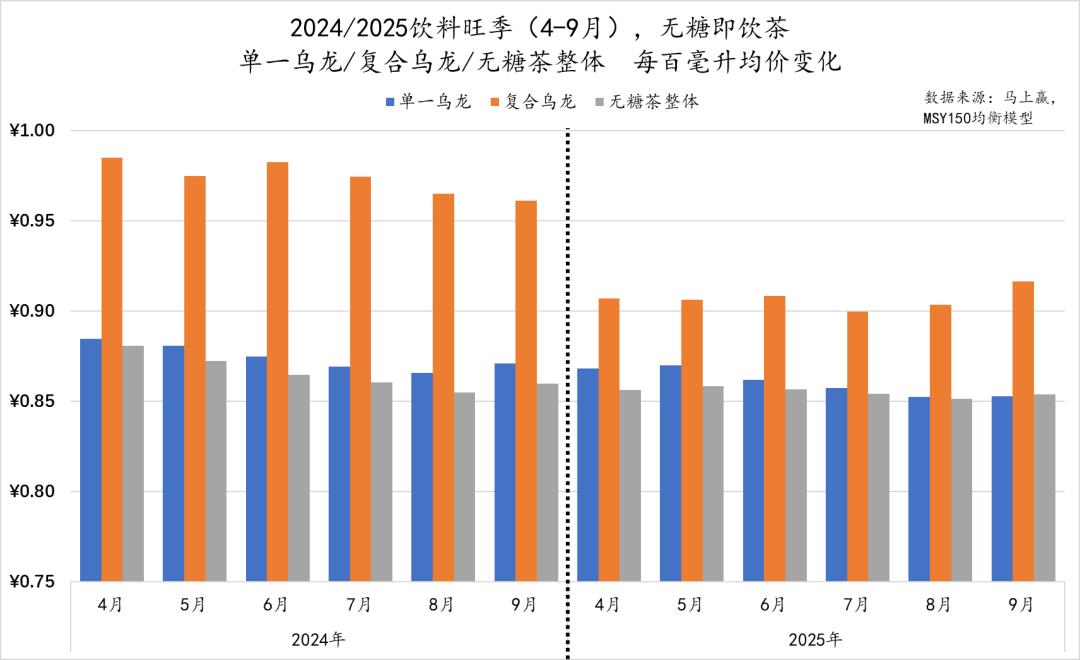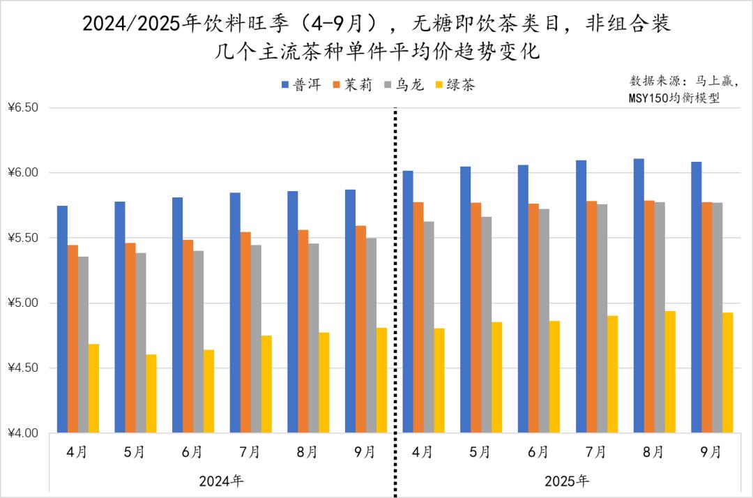 上文中,已经提及了部分无糖茶内乌龙茶种的占比、以及价格上的变化。整体来看,乌龙的占比在无糖茶类目中整体保持稳定,价格上则在2025年旺季相比2024年,有一定的件均价同比上升迹象。