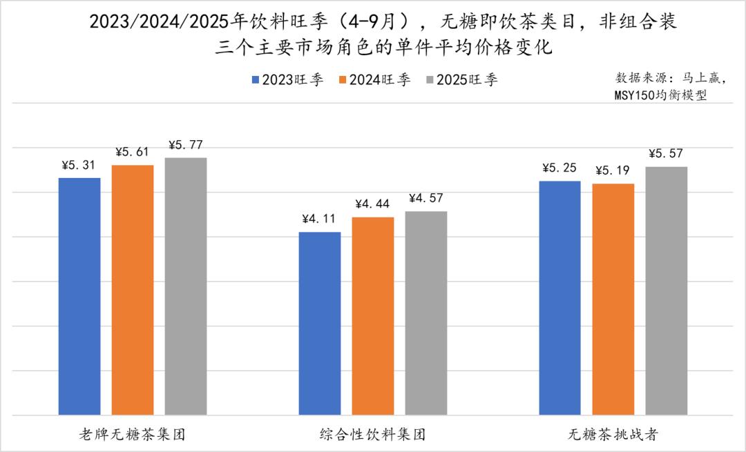 从2023年-2025年饮料旺季(4-9月)的三角色集团非组合装产品的单件平均价格来看,三者均整体上升,但不同集团存在明显区别。其中,老牌无糖茶集团的件均价逐年上涨,且在三角色集团的对比中始终保持相对高的水平;而综合性饮料集团的件均价是三角色中唯一低于5元的,虽然同样逐年上升但整体明显偏低。