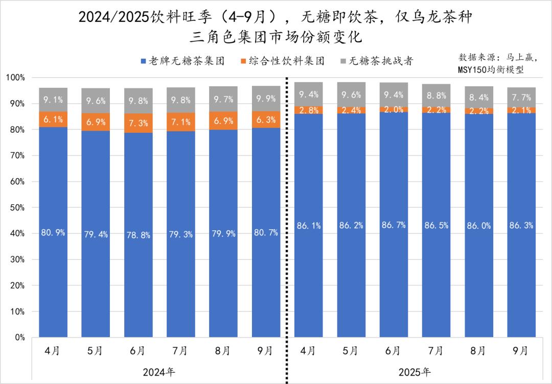 沿用上文三角色市场集团划分的方式对乌龙茶种的市场格局进行观察,可以看到,整体的茶种市场份额结构上与无糖茶类目整体的情况一致,依然是农夫山泉+三得利构成的老牌无糖茶集团占比超过85%,且在2025年旺季,其市场份额相当的稳定。