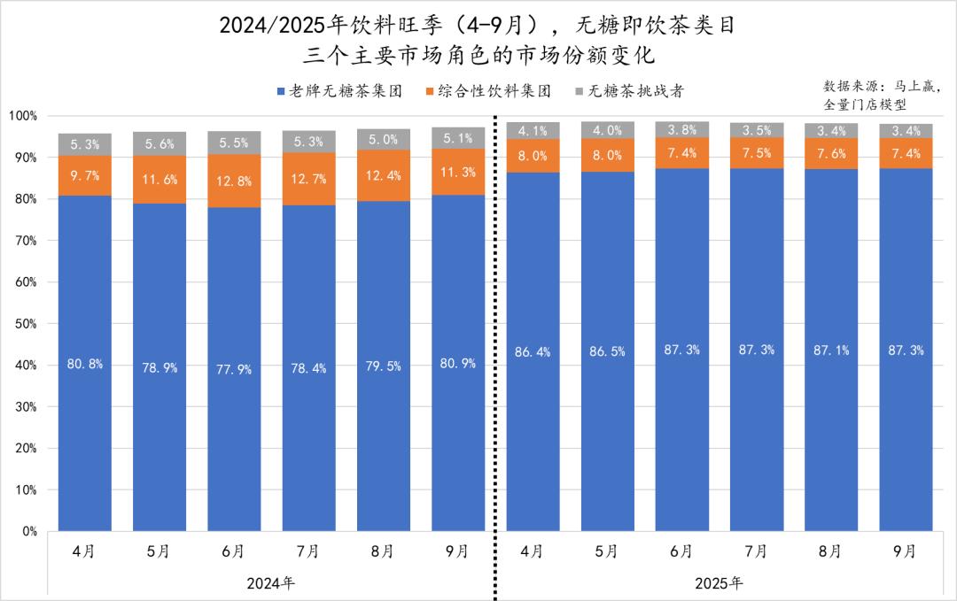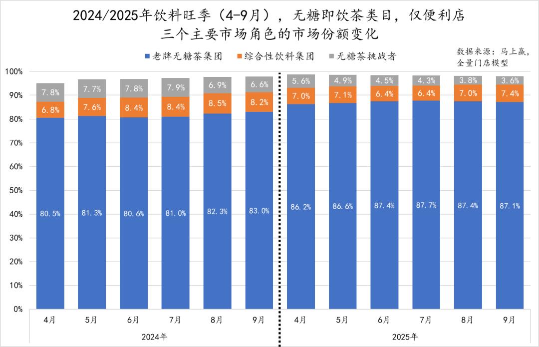 与此对应的则是渠道积累相对较薄弱、以便利店货架为核心起盘的无糖茶挑战者们,其在仅便利店业态中的市场份额,在2025年旺季开始的4月,还有5.6%(整体4.1%),但在2025旺季结束的9月,仅剩3.6%(整体3.4%)。