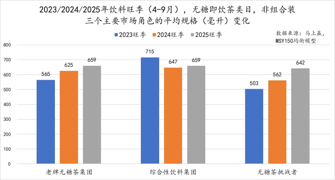 在规格上,三个角色在2023-2025年旺季表现出了不同的趋势,但在2025年旺季时已经趋于靠拢。其中,老牌无糖茶集团、无糖茶挑战者集团的平均规格有着较为明显的上升,体现出大规格化的趋势。品牌们正在通过进一步的规格细分,适应不同消费场景的需求。相比来说,综合性饮料集团的平均规格虽然在三者之间处于高位,但并未显著呈现上升趋势,2025年旺季同比2024年仅有轻微增长。