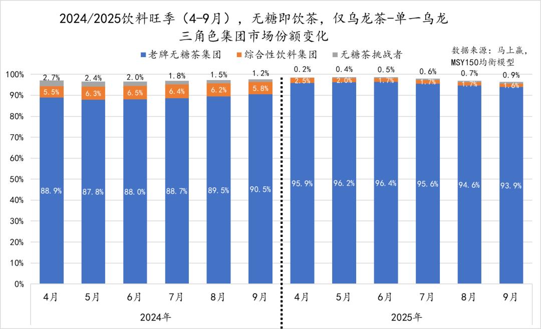 从单一乌龙茶种市场的三角色分位格局来看,老牌无糖茶集团始终居于主导地位,且在2025年旺季同比2024年旺季,这一格局还有持续加强的迹象。在2025年旺季,老牌无糖茶集团在单一乌龙这一口味内的峰值市场份额已经超过95%。相比来说,综合性饮料集团在单一乌龙中的市场份额接近腰斩。无糖茶挑战者们的市场份额则不足1%,市场份额同样腰斩。
