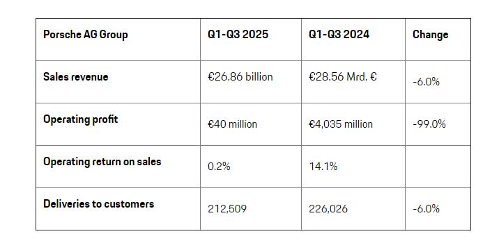 保时捷刚刚交了一份冰冷且残酷的财报:2025年前9个月,集团营业利润从去年同期的约40亿欧元断崖式坠落至区区4000万欧元——缩水99%,近乎百倍。