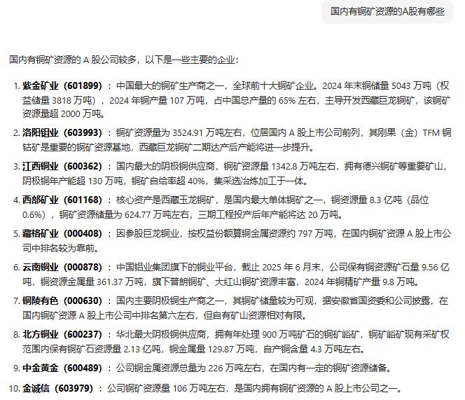 以下是一些通过提问AI给出的有铜资源的上市公司名单,可以参考挖掘: