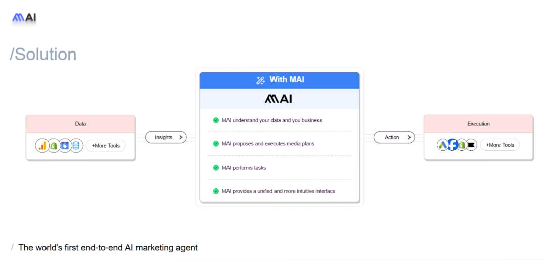我们的 ICP(Ideal Customer Profile,理想用户画像)是中小企业,目前更聚焦在 DTC(Direct to Consumer)商户群体。这些商户有相当复杂的效果营销数据体系和增长需求,正是MAI的AI Agent旨在服务的场景。