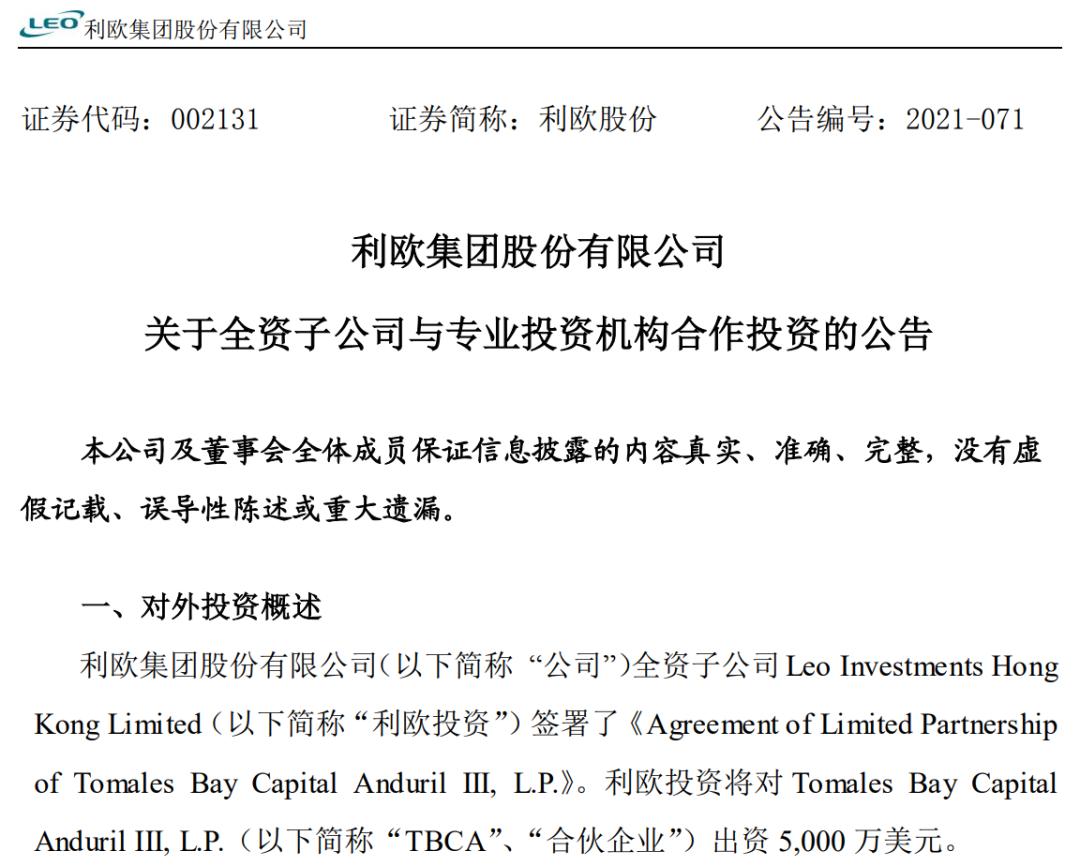 在投资公告发布仅一个礼拜,利欧股份再度公告称,TBCA的普通合伙人Tomales Bay Capital Anduril III GP, LLC向公司发出邮件表示,其无法接受利欧投资继续持有LP份额,并拟退还利欧投资出资款。