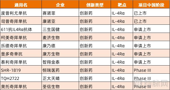 图1. 国内临床进度居前的IL-4Rα单抗创新药管线(资料来源:医药魔方)