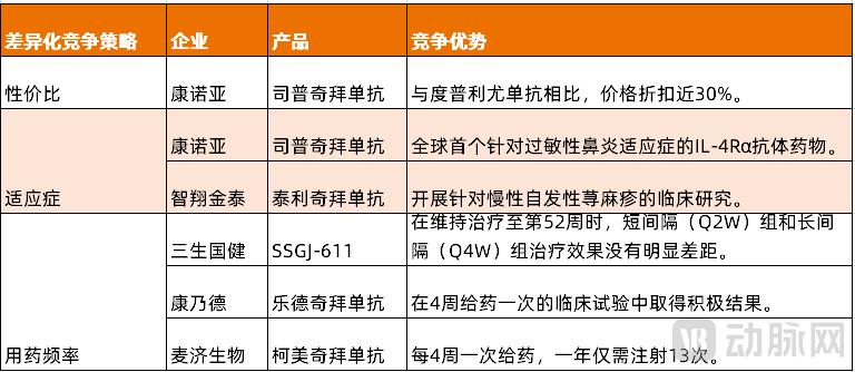 图2. 国内IL-4Rα单抗的差异化竞争策略(资料来源:动脉网整理)