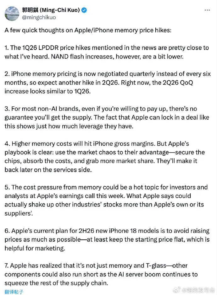 这一猜测与今年1月知名分析师郭明錤的想法几乎一致。当时,郭明錤就曾认为,早在年初苹果内存采购价变成按季度谈判时,苹果就已经开始凭着极高的议价能力扫货了。
