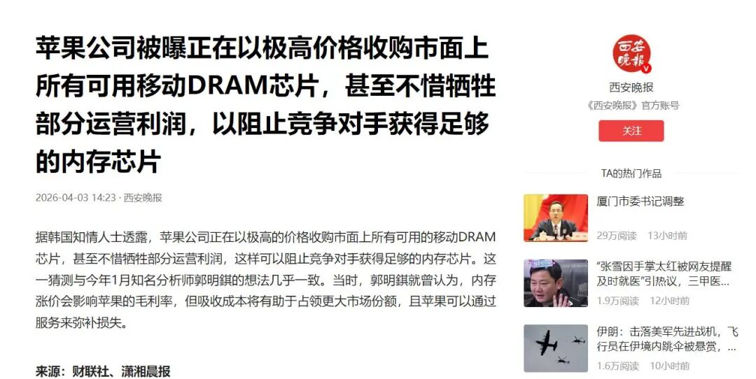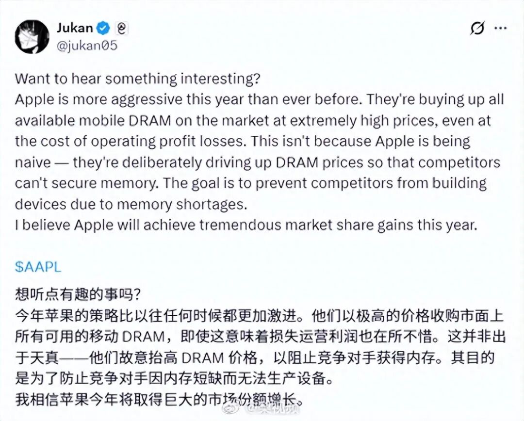 据韩国知情人士透露,苹果公司今年的策略比任何时候都更加激进,他们以极高的价格收购市面上所有可用的移动DRAM芯片,甚至不惜损失运营利润也在所不惜,这样可以阻止竞争对手获得足够的内存芯片。